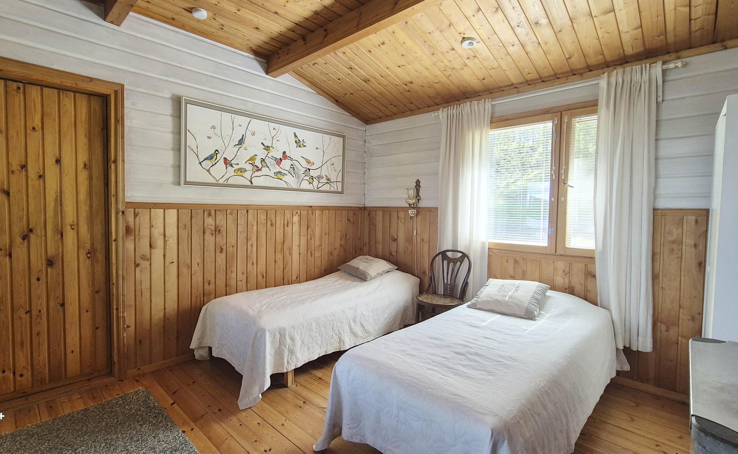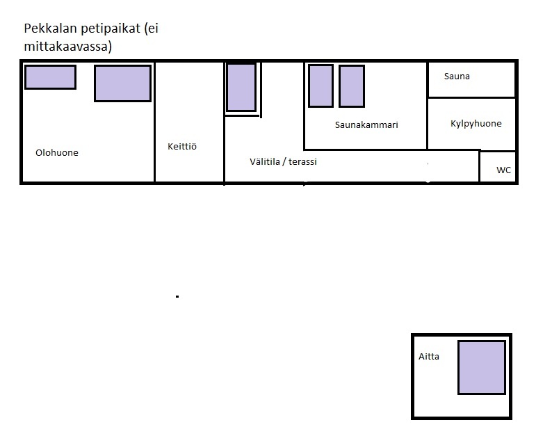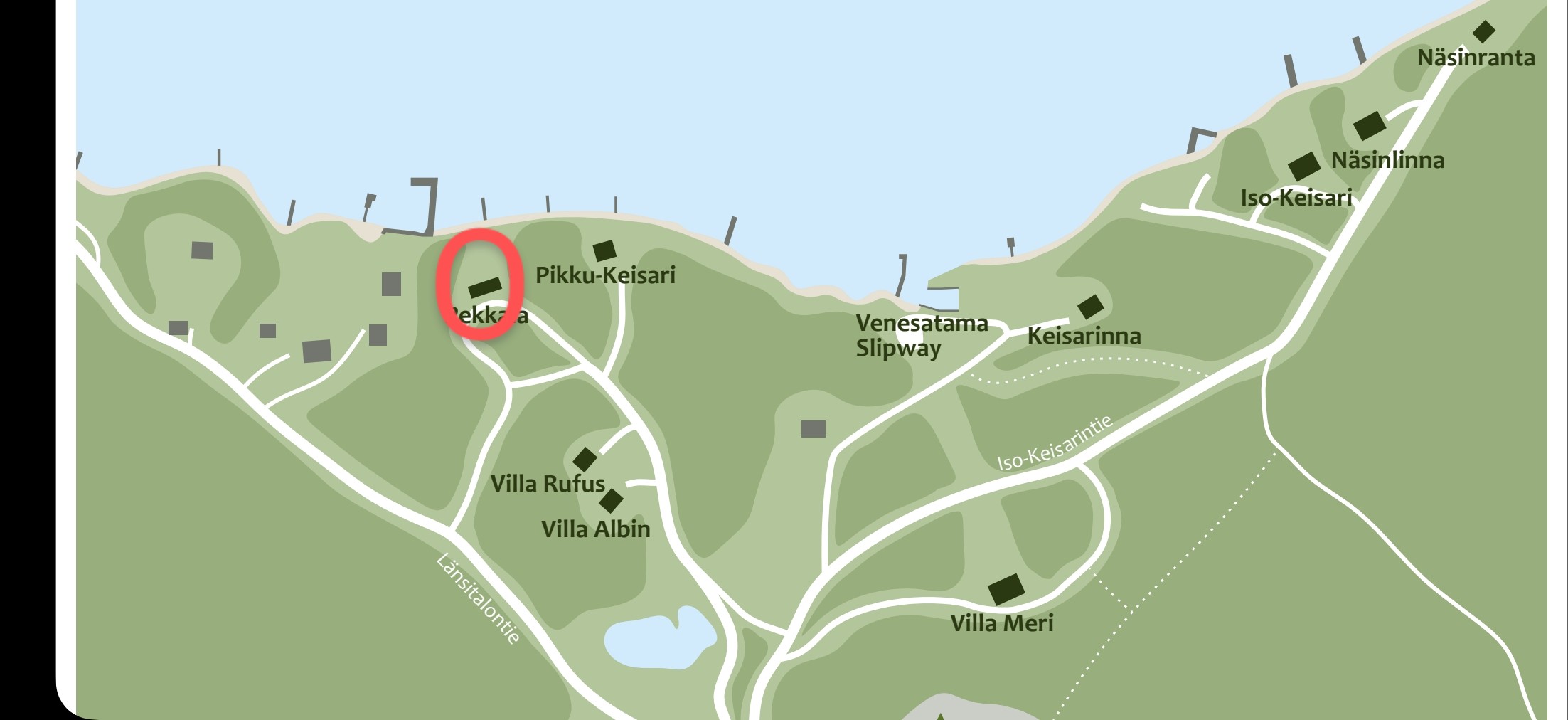 Im nördlichen Teil von Pekkala befinden sich das Wohn/Küchenbereich, während sich im südlichen Teil die holzbeheizte Sauna mit Dusche und ein Zweibettzimmer befinden. Es gibt ein Wohnzimmer -grosses Fenster mit Blick auf den Sonnenuntergang, Ostsee-Archipel. Die Küche ist komplett ausgestattet. Pekkala ist ein traditionelles finnisches Mökki mit zwei Terrasse und felsiger Kiefernwald von Hinterhof aus. Haustiere sind willkommen.